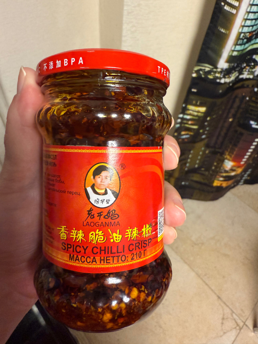 думаю где же я её видела. И вспомнила: мы летели китайскими авиалиниями (не в этом году) и там когда подавали еду предлагали и эту баночку. Я знать не знала, что это. Но слово Чили как слышу - так да, мне надо 😄Вообщем на рис положили ложечку и мне так понравилось. Острое, вкусное. Вот как я люблю.