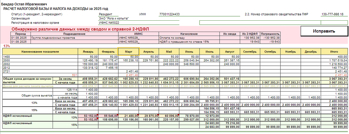 Самая простая проверка НДФЛ нарастающим итогом по разным ставкам (в том числе РКСН)