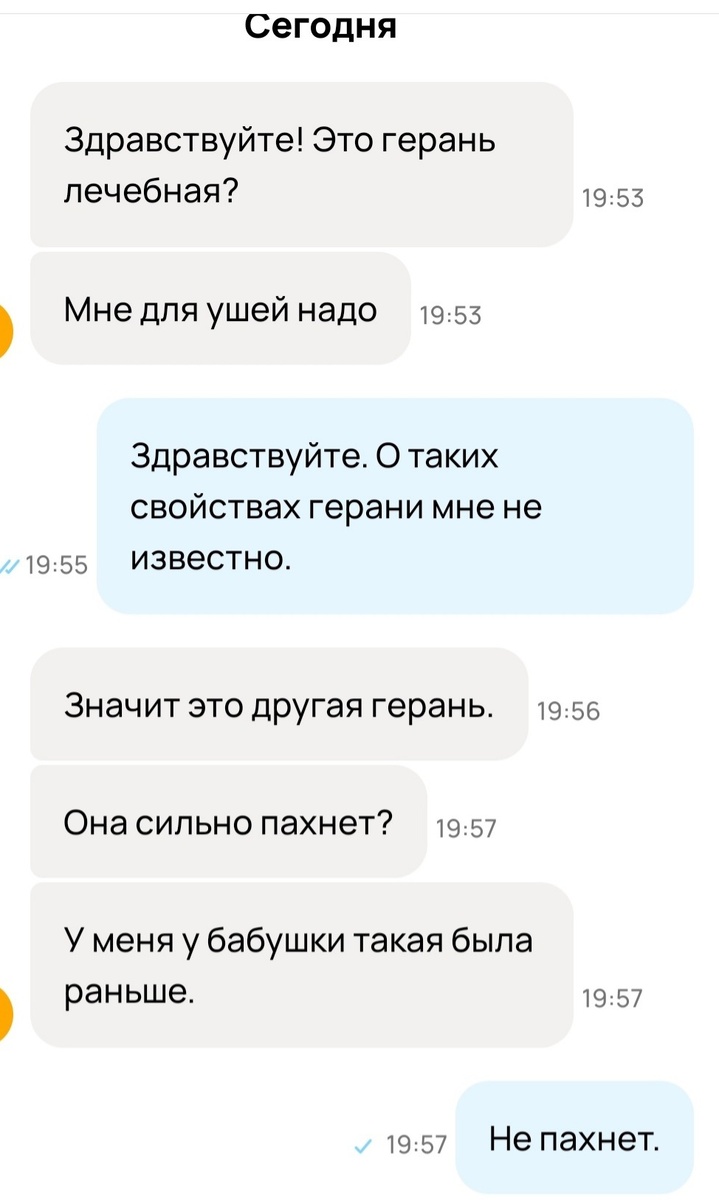 Привет, читатель моего канала. Кто-нибудь слышал про лечебные свойства герани? Нет, я серьезно! Может и есть таковые, кто знает))) А то так продаешь цветок, а он еще и волшебный лечебный оказывается🤣 Вот и я разместила на авито уже подросшие отростки королевской герани. Выглядят шикарно, весной уже должны цвести. Смотрят неплохо, потихоньку лайки ставят, даже нашлись и такие, кто традиционно клятвенно пообещал "в среду вот точно-точно заберу". В общем, все как обычно, мы уже с вами ведь ничему не удивляемся. Но ... и в наши серые будни проклюнулись лучи чистой ржачки (ну не могла устоять не посмеявшись). Спрашивает женщина насчет лечебных свойств цветка. Да, в общем-то, вот и скрин переписки. Ну никак не ожидала, что герань моя понадобится покупателю "для ушей". Конечно, можно бы и остановиться на том, что это "другая герань" (какая другая), да и разойтись с миром, но собеседница не унимается, добивая меня вопросами про запах и информацией, что у её бабушки такая же была (может