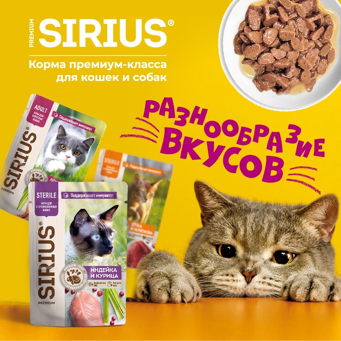 Влажные корма SIRIUS — это сбалансированное питание и настоящее удовольствие для вашего питомца. Мы создали разнообразное меню, чтобы каждый мог найти вкус по душе: Порадуйте любимца новыми вкусами и превратите каждый обед в маленький праздник! А какой вкус больше всего любит ваш питомец? Поделитесь в комментариях — давайте вместе составим рейтинг самых популярных вариантов!