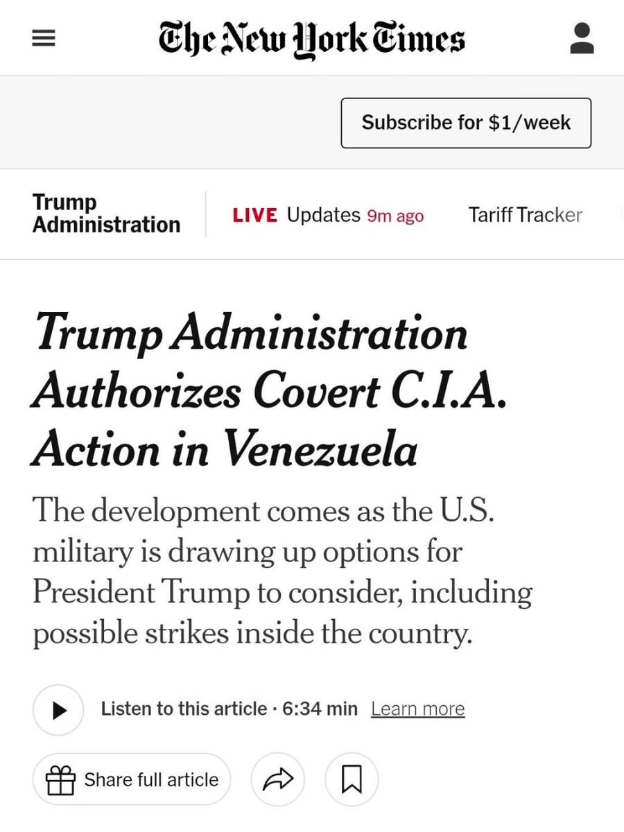 В ответ на пост Trump authorizes ‘LETHAL OPERATIONS’ by CIA in Venezuela – NYT Secret authorization allows agents to ‘unilaterally’ target Maduro and his government Shadow war in full swing as real war draws closer