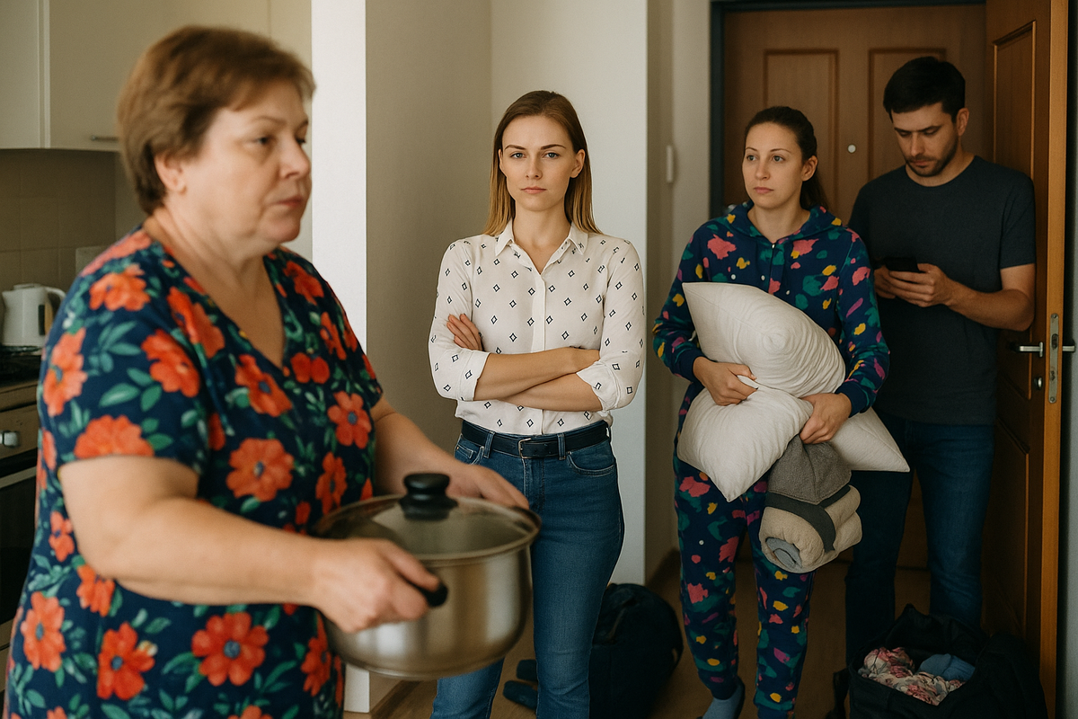 Валентина Ивановна держала в руках большую кастрюлю. Рядом с ней — Лариса, золовка Киры, с подушкой под мышкой и электрочайником в другой руке. За Ларисой топтались двое детей — Даша и Вова, пять и семь лет, каждый тащил по пакету с одеждой.