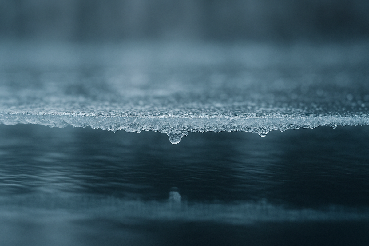 ΠΠΎΠ³Π΄Π° ΡΠ΄Π°ΡΡΡΡ ΠΏΠ΅ΡΠ²ΡΠ΅ ΠΌΠΎΡΠΎΠ·Ρ, Π½Π° ΡΠΏΠΎΠΊΠΎΠΉΠ½ΠΎΠΉ Π³Π»Π°Π΄ΠΈ Π²ΠΎΠ΄Ρ ΠΏΠΎΡΠ²Π»ΡΠ΅ΡΡΡ ΡΠΎΠ½ΠΊΠ°Ρ ΠΊΠΎΡΠΊΠ°. ΠΡΠΎ Π½Π΅ Π»ΡΠ΄, ΠΏΠΎ ΠΊΠΎΡΠΎΡΠΎΠΌΡ ΠΌΠΎΠΆΠ½ΠΎ Ρ ΠΎΠ΄ΠΈΡΡ, β Π²ΡΠ΅Π³ΠΎ Π½Π΅ΡΠΊΠΎΠ»ΡΠΊΠΎ ΠΌΠΈΠ»Π»ΠΈΠΌΠ΅ΡΡΠΎΠ². ΠΠΎΡΡΡ ΡΠ΅ΠΌΠΏΠ΅ΡΠ°ΡΡΡΠ° ΠΏΠ°Π΄Π°Π΅Ρ Π΄ΠΎ β3β¦β5 Β°C, Π²ΠΎΠ΄Π° ΡΠ²Π΅ΡΡ Ρ ΠΎΡΡΡΠ²Π°Π΅Ρ ΠΈ Π·Π°ΠΌΠ΅ΡΠ·Π°Π΅Ρ, Π½ΠΎ Π΄Π½ΡΠΌ ΡΠΎΠ»Π½ΡΠ΅ Π»Π΅Π³ΠΊΠΎ ΡΠ°Π·ΡΡΡΠ°Π΅Ρ ΡΡΠΎΡ Ρ ΡΡΠΏΠΊΠΈΠΉ ΡΠ»ΠΎΠΉ.