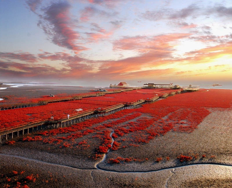 Необычное место для свиданий в Китае включают Красные пляжи в Панцзине с их пурпурным травяным покровом. Сентябрь-ноябрь — самое подходящее время, когда местная трава «сведа» приобретает насыщенный пурпурный цвет, создавая неземной пейзаж. Можно прогуляться по деревянным настилам и смотровым площадкам, наблюдая за редкими птицами. Этот необычный вид создают не песок, а многочисленные красные водоросли, покрывающие территорию заповедника Шуантай-Хэкоу на реке Ляохэ. Туристы могут посетить лишь небольшую часть пляжа, где для них построены мосты и смотровые площадки. Мечтализируем 🫰