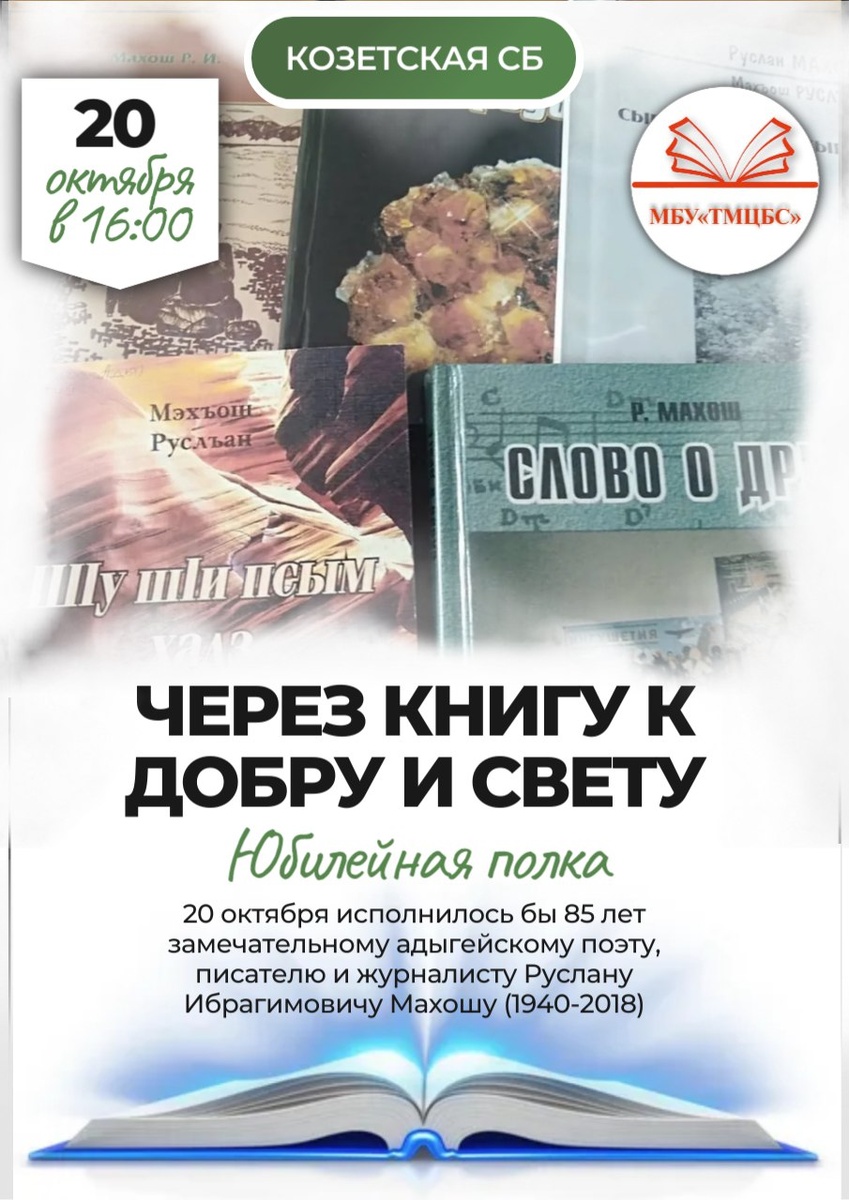 📚✨Анонс. Юбилейная полка «Через книгу к добру и свету»✨📚 20 октября 2025 г. 16:00 – 17:00 Козетская СБ Дорогие друзья! 20 октября исполнилось бы 85 лет замечательному адыгскому поэту, писателю и журналисту Руслану Ибрагимовичу Махошу, заслуженному работнику народного образования и культуры Республики Адыгея, оставившему заметный след в сердцах многих людей. Руслан Махош известен как поэт-песенник: его стихи были переложены на музыку известными композиторами Адыгеи и стали настоящими жемчужинами нашей музыкальной культуры. Его творчество продолжает вдохновлять новые поколения. В честь юбиляра мы организуем выставку, на которой будут представлены его книги, а также литература о его жизни и творчестве. Эта выставка — уникальная возможность не только познакомиться с произведениями автора, но и глубже понять его влияние на культуру и общество нашего времени.