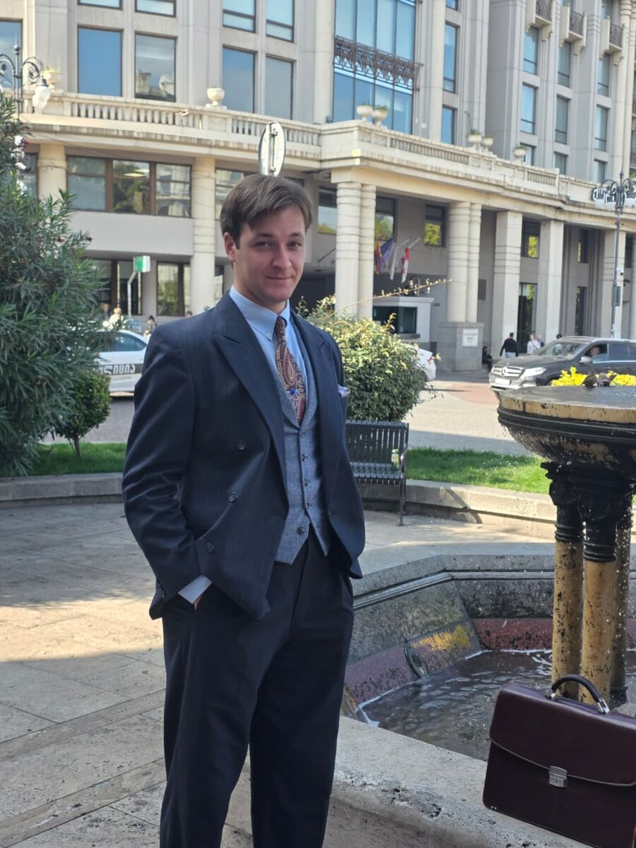 В 10.57 стремительными шагами к месту нашей стоянки подошёл Он. Не узнать Его было невозможно: синий двубортный пиджак с атласным платком в кармашке, жилетка с галстуком, начищенные до блеска ботинки, широкие брюки с отворотами и кожаный портфельчик в руке. Человек из другой эпохи.