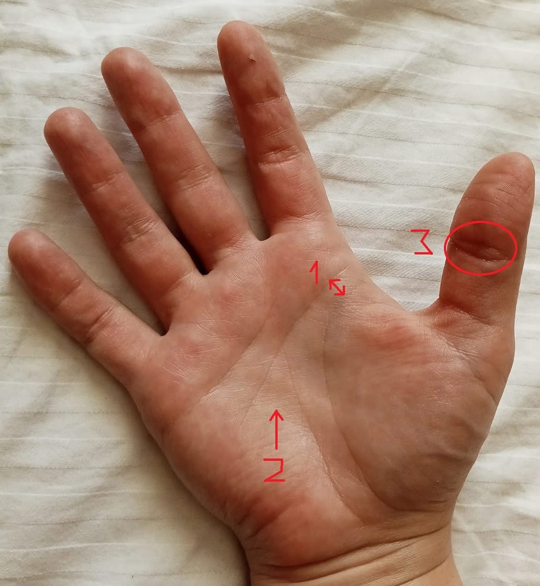 К небесам обращаться хорошо, сидя на веранде своего дома, с чашкой ароматного чая (я предпочитаю игристое или порто). А пока веранды нет, то бери мяч и фигачь. Вы барышня не из тех, кого радует стабильность. Ваш знак авантюриста 1 (расстояние между линиями Жизни и Головы) говорит о новых возможностях, которые вы сами себе устраиваете. Потому имеете полное право на новую крышу над головой. Главное – не упустить даже не шанс, а уже полученный бонус. Ваш треугольник денег не закрыт 2 и возможность в очередной раз спустить нажитое появится. Придержите ваши нервы. Но, без крыши над головой не останетесь, судя по зерну пшеницы 3 на большом пальце. Может третий брак?