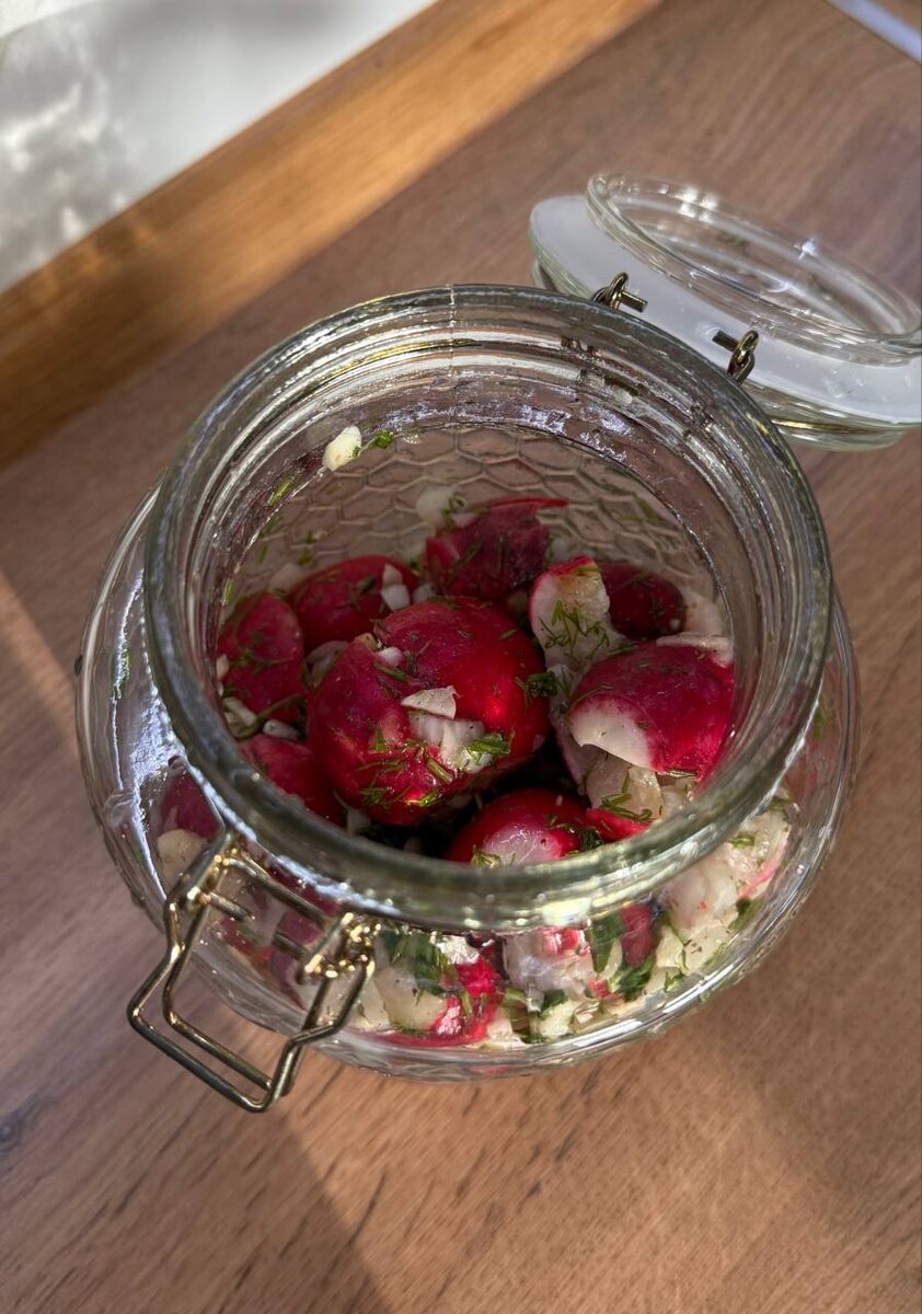 Ингредиенты:– редис– лук– укроп– чеснок– масло подсолнечное– уксус– соль/сахар