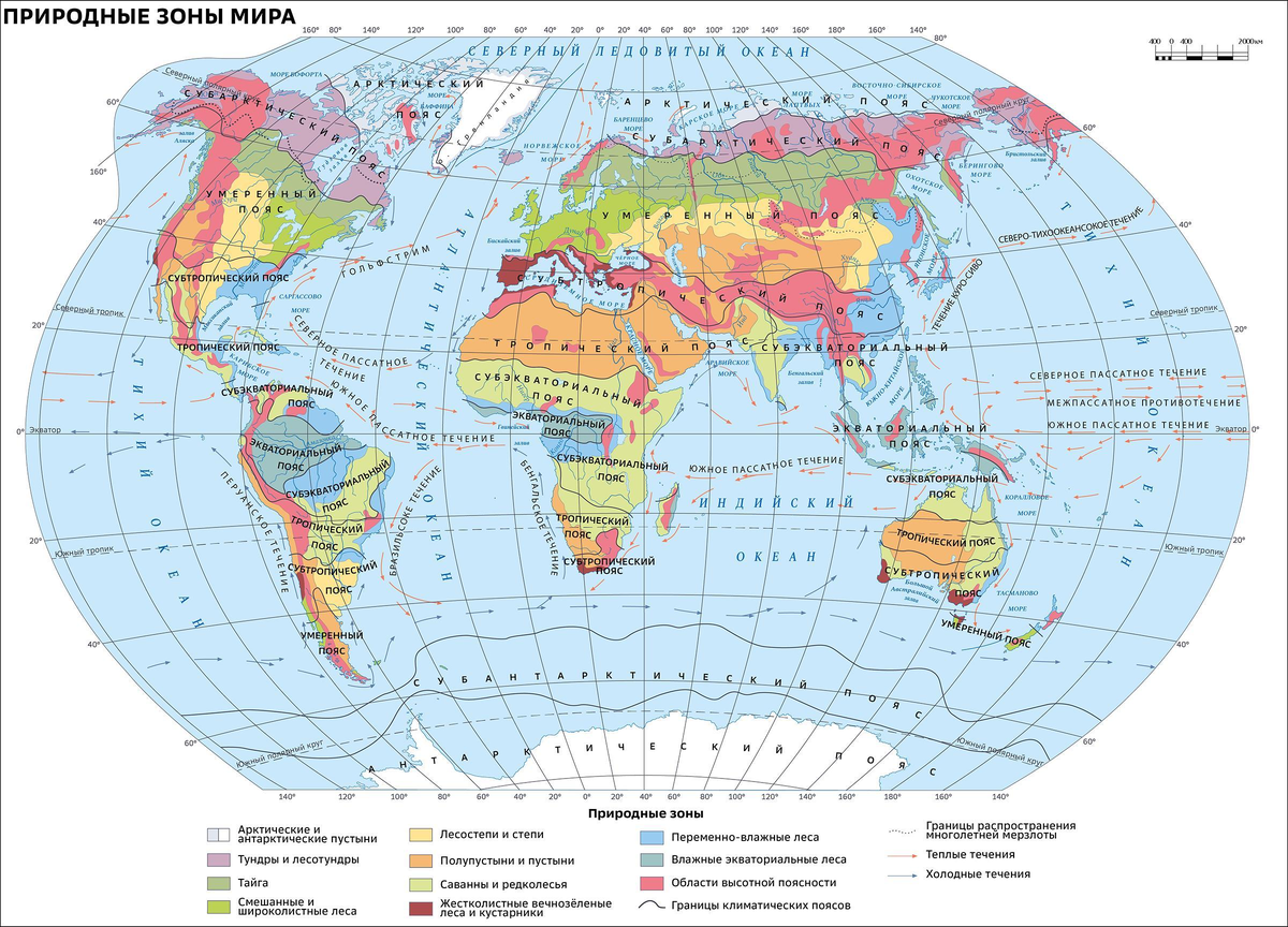 Из-за разного количества солнечного света и тепла на Земле формируются особые природно-территориальные комплексы — природные зоны. Они отличаются своим климатом, почвами, растительным и животным миром. Даже выветривание горных пород в разных природных зонах происходит по-разному. Там, где жарко и влажно, активно происходит химическое выветривание. В местах, где наблюдаются разные по температуре сезоны года, — физическое выветривание. Природными зонами (от греч. «пояс») называются расположенные на одинаковом расстоянии от экватора части географической оболочки или природно-территориальные комплексы. Природные зоны называются по преобладающему типу растительности, которая тоже зависит от климата — количества тепла и света, например лесная зона, зона степей, зона тундры. Природные зоны есть на суше и в океане, но на суше они проявляются заметнее. Природные зоны размещаются согласно широтной зональности — широтными полосами к северу и к югу от экватора к полюсам. В экваториальных широтах