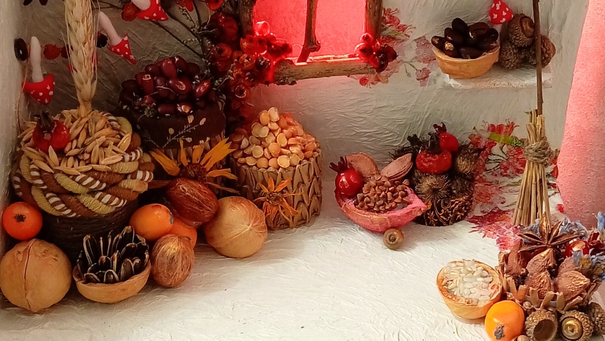 Всем привет 👋 и добро пожаловать на мой канал! 😊 Сегодня хотела бы провести не большой обзор совместной поделки с ребенком в детский сад! - ОСЕННЯЯ КЛАДОВАЯ. 🍁🍂 Надеюсь это Вам поможет определится с темой или Вы сможете почерпнуть какие нибудь идеи! 🤔 Шаг 1. Найти основу За основу мы взяли несколько коробок из под светофоровских сладостей. 😊 склеили их друг с другом на клей ПВА и малярный скотч, получив некое подобие комнаты. В одной из стен - вырезали окно и добавили несколько полочек из картона. Шаг 2. Внутренняя отделка Получившуюся конструкцию мы обклеили обычными салфетками на любимый клей ПВА 😍 и покрасили сверху обычной белой акриловой краской. Затем нам захотелось не много ярких пятен и мы добавили несколько оранжевых салфеток. В идеале, сюда подошли бы какие нибудь рисунки осенних листьев, но у меня таких не было - поэтому чем богаты тому и рады 😂 Шаг 3 - Собирательство 🍂 В течении недели во время прогулки мы с ребенком занимались собирательством 🤣 Искали красив