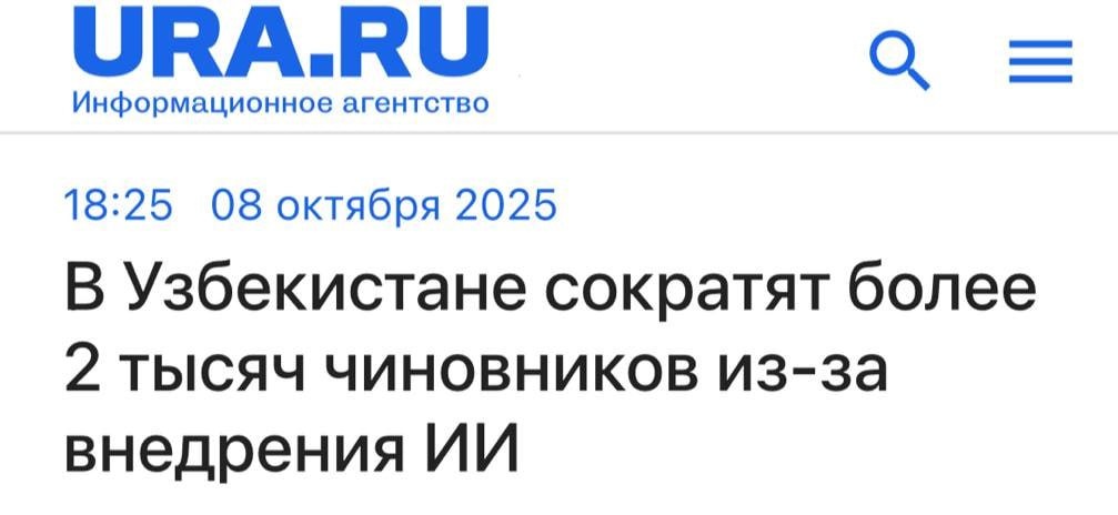 В Узбекистане 2141 чиновника заменят на ИИ Президент подписал указ: с 1 ноября в нескольких министерствах начнут сокращения, а их функции частично отдадут алгоритмам. Больше всего достанется налоговой — почти полтысячи мест под нож. Звучит жёстко, но логично: ИИ не берет «на чай», не забывает дедлайны и не уходит в отпуск. Вопрос другой — кто будет отвечать за баги и ошибки решений? Это пилот про эффективность или красивая экономия на людях? Вы бы доверили «цифровому чиновнику» бумажки, штрафы и льготы? #Techtaim