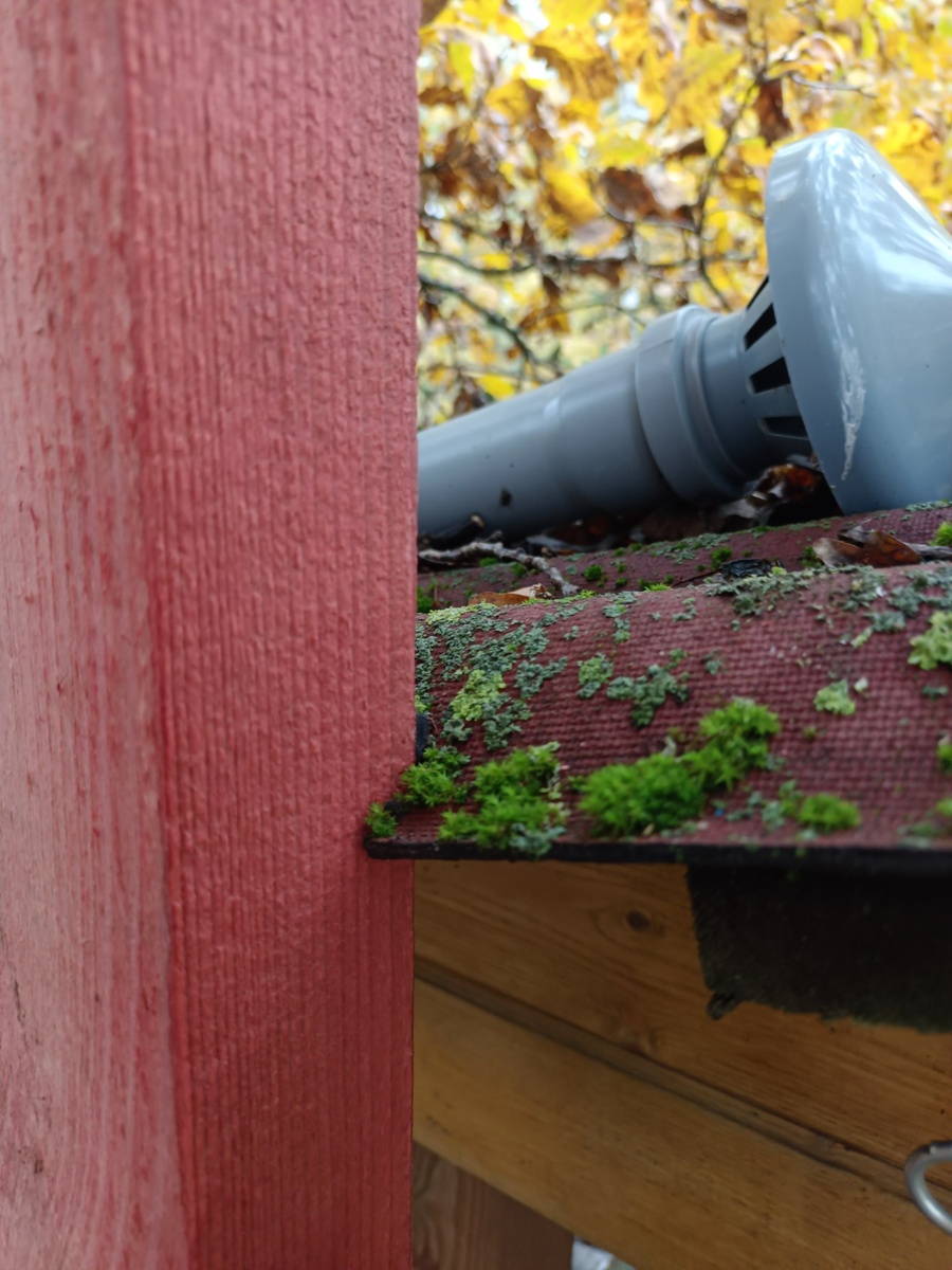 Высокая сторона аккурат врезается в крышу сарая. Буквально на один сантиметр. Подрезал и загнул вверх однулин, и у стропила уголок убрал. Это не новая постройка кривая, это сарай на несколько сантиметров по геометрии расхождение имеет.