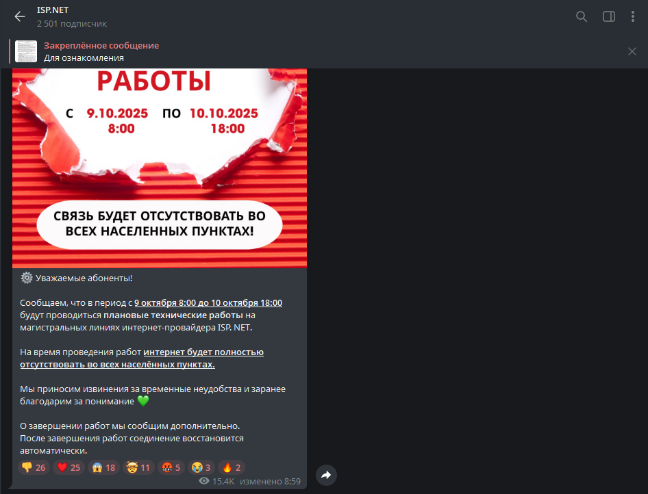 Ожидается, что интернет появится к вечеру 10 октября. До этого момента регион фактически окажется в цифровой изоляции — без привычных каналов связи и доступа к информации.