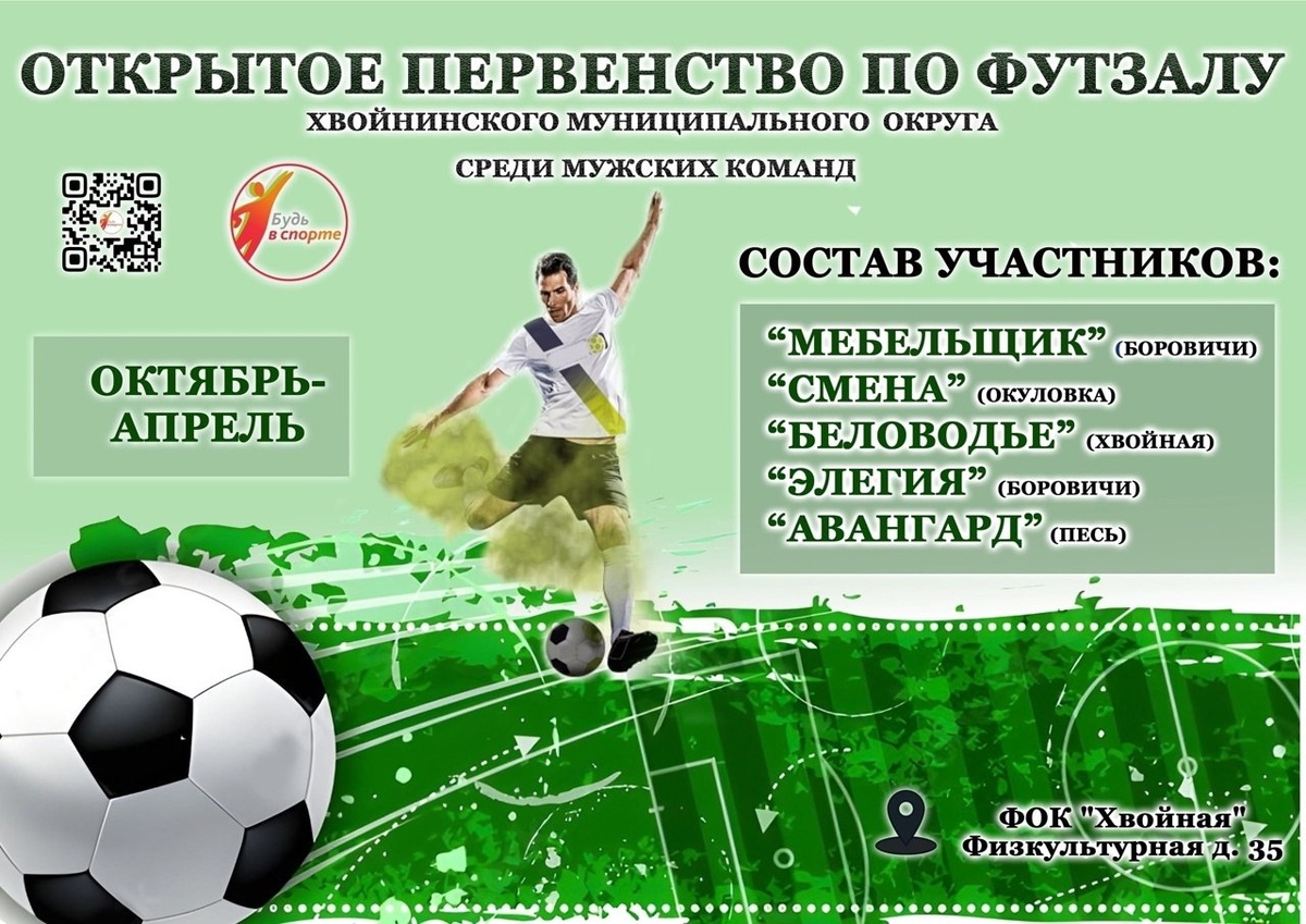 С 25 октября стартует открытое Первенство Хвойнинского муниципального округа по футзалу среди мужских команд! Соревнования пройдут с октября 2025 года по апрель 2026 года. В турнире примут участие пять команд: "Мебельщик" (Боровичи); "Элегия" (Боровичи); "Беловодье" (Хвойная); "Смена" (Окуловка); "Авангард" (Песь). Первенство начнётся 25 октября 2025 года игрой за Суперкубок между командой "Мебельщик" (Боровичи) — победителем Открытого Первенства Хвойнинского муниципального округа по футзалу среди мужских команд сезона 2024–2025 гг. и обладателем Кубка Хвойнинского округа "Беловодье" (Хвойная). Это будет яркое событие, которое откроет новый футзальный сезон!