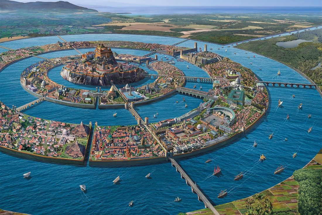 Но самое интересное в этой истории — это описание столицы Атлантиды. Город, построенный по концентрическому принципу, с чередующимися кольцами суши и воды. В самом центре — холм, на котором стоял храм Посейдона и дворец царей. Три водных канала, соединённых с океаном, превращали столицу в неприступную крепость и процветающий порт. Выглядит как мечта любого градостроителя и военного инженера. Платон приводит даже точные размеры: внешний водный канал имел ширину в три стадия (около 540 метров), следующий за ним земляной вал — столько же. Второй водный канал был в два стадия, как и следующий вал. А внутренний канал, опоясывающий центральный остров, — в один стадий. Сам остров имел в диаметре пять стадиев, то есть почти 900 метров.