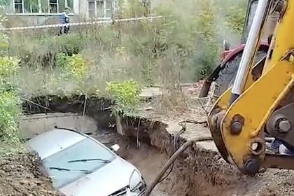 Автомобиль провалился в яму из-за размыва грунта в Липецке