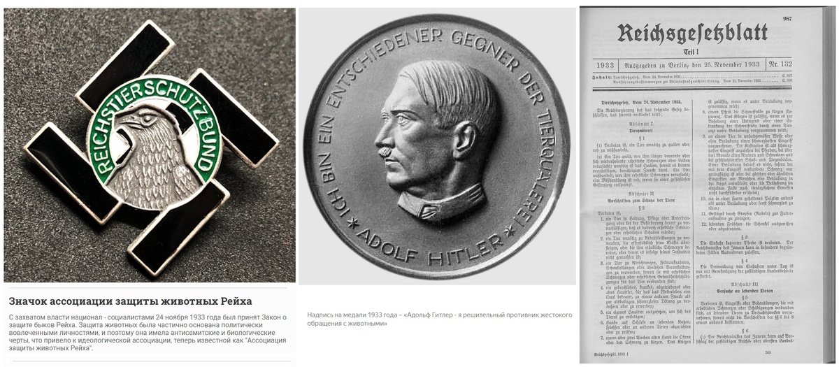 Придя к власти, нацисты не только приняли ряд законов, беспрецедентных по своей строгости, но и создали целую государственную систему для их продвижения. Уже в 1933 году была основана Имперская ассоциация защиты животных Рейха, а 24 ноября того же года вступил в силу «Имперский закон о защите животных» (Tierschutzgesetz). Этот документ, один из пяти ключевых природоохранных актов режима, который удалось найти и нотариально заверить в переводах, запрещал любые «ненужные» страдания животных, регулировал их транспортировку и убой. В 1934-м последовал «Закон об охоте» (Reichsjagdgesetz), ограничивающий отстрел дичи, а в 1935-м — «Имперский закон о защите природы» (Reichsnaturschutzgesetz). Для поощрения сторонников этой политики была учреждена даже специальная медаль за защиту животных с автопортретом Гитлера.
