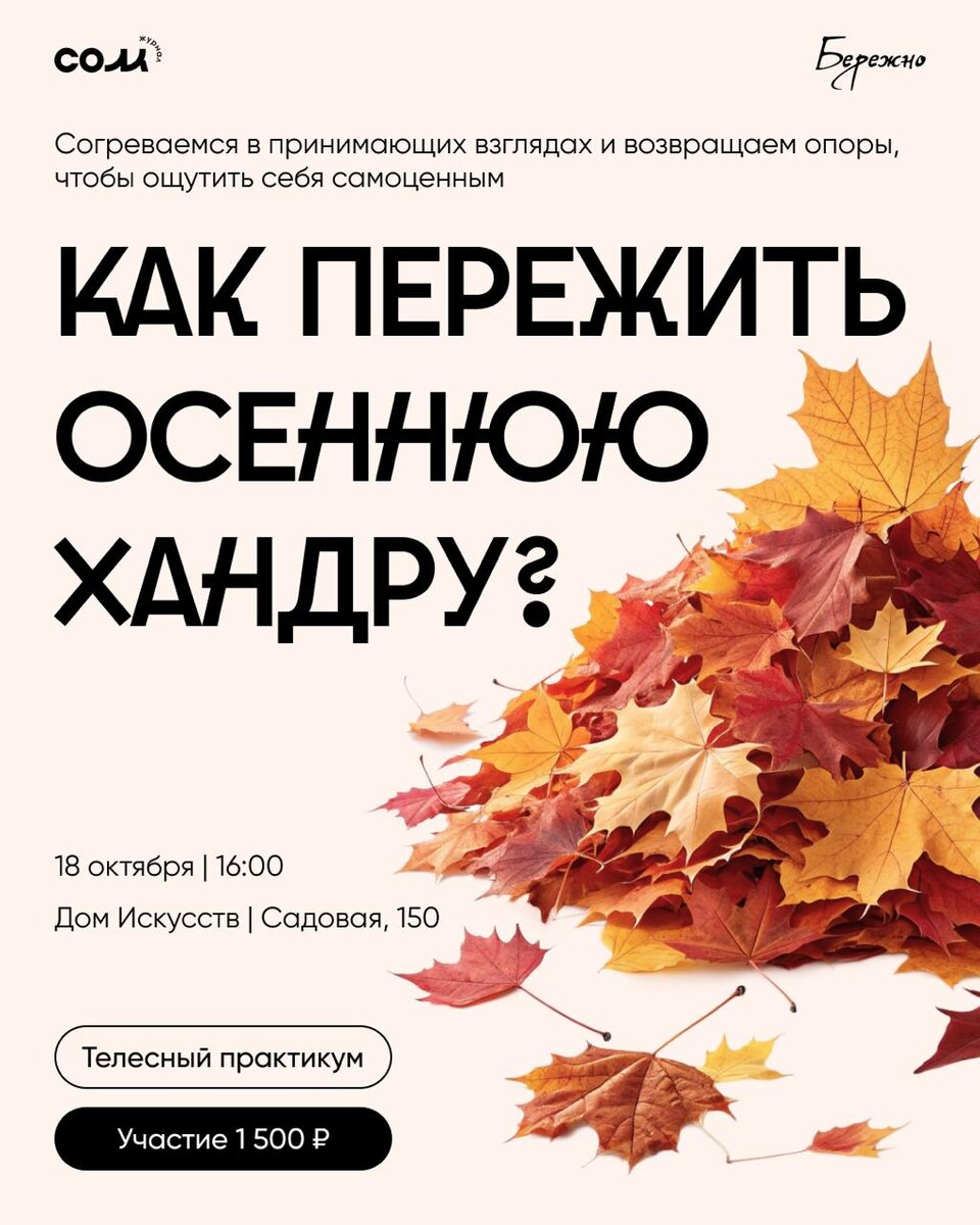 Вокршоп «Как пережить осеннюю хандру» 18 октября совместно с психологическим центром «Бережно» мы проводим телесный практикум «Как пережить осеннюю хандру?». Вместе с ведущим психологом Юлией Пученковой будем: — учиться распознавать сигналы своего тела; — снимать внутреннее напряжение; — искать тепло и поддержку — в себе и рядом; — проживать осень без суеты и усталости. Это не лекция и не тренинг. Это уютное пространство, где можно быть услышанными, увиденными, принятыми 💛 🟠18 октября, начало в 16:00 🟠Дом Искусств на Садовой, 150 🟠Стоимость – 1500 рублей. Количество мест ограничено: для записи пишите Юлии. Приходите согреваться в принимающих взглядах и возвращать внутренние опоры, чтобы ощутить себя самоценным. #сом_бережно