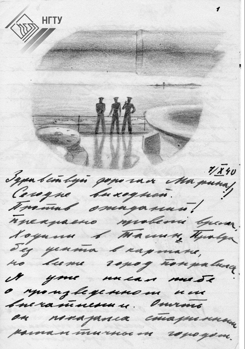 Он пишет о службе, морских буднях, о прогулках по Таллину, о встречах и мечтах. ✍️ На полях — рисунки моряков и силуэт дамы в шляпе.