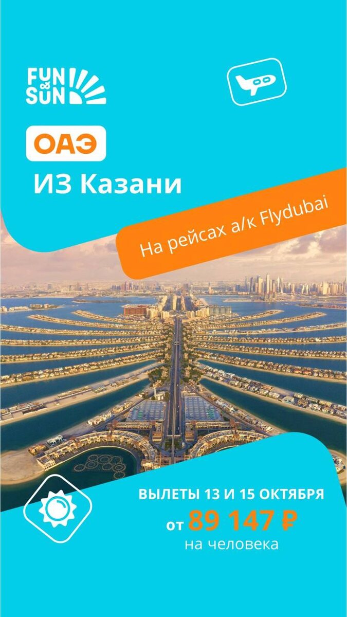🇦🇪 ОАЭ из Казани! ✈️ Прямые рейсы авиакомпанией Flydubai с багажом 20+7 кг и горячим питанием на борту. 🧳 13 октября |7 ночей | 2 взрослых: ⭐ Grand Cosmopolitan Hotel 5* — от 89 147 руб/чел ⭐ Ja Ocean View Hotel 5* — от 127 166 руб/чел ⭐ NH Collection Dubai The Palm 4* — от 141 668 руб/чел ⭐ RIU Dubai 4* — от 167 493 руб/чел 🧳 15 октября | 7 ночей | 2 взрослых: ⭐ Movenpick Jumeirah Lakes Towers 5* — от 98 336 руб/чел ⭐ Taj Jumeirah Lakes Towers 5* — от 129 779 руб/чел ⭐ Sofitel Dubai Jumeirah Beach 5* — от 145 675 руб/чел ⭐ Intercontinental Dubai Marina 5* — от 151 946 руб/чел Ваш WT Казань 💛