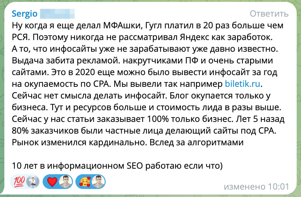 Подверждаю - блог на сайте нужен только бизнесу, чтобы собирать трафик и зарабатывать на своих товарах- услугах. Эра статейников ушла. См. картинку, пишут умные ребята. С другой стороны, я знаю лично умных ребят, которые делают сеть сайтов на базе ИИ для продвижения своих сервисов... И это работает. Баннера рекламные ставят на все сайты с рекламой своего сервиса... 8 лидов в день. Русский ИТ бизнес