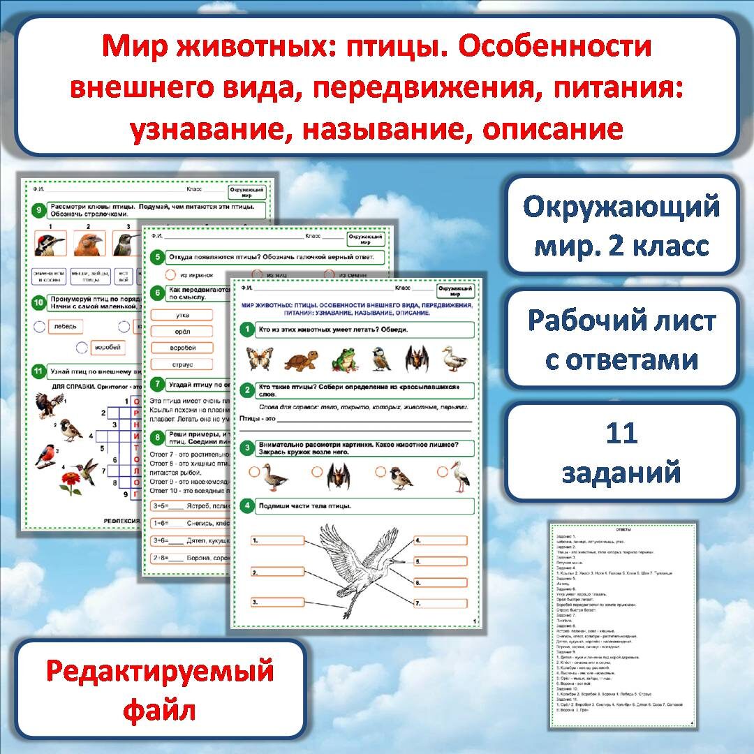 Рабочий лист «Мир животных: птицы. Особенности внешнего вида, передвижения, питания: узнавание, называние, описание» разработан к уроку окружающего мира во 2 классе. Рабочий лист состоит из 11 заданий. Все задания тщательно продуманы и логично выстроены. Если вам вдруг покажется, что их слишком много, вы сможете убрать часть заданий в редактируемом файле. Но, на мой взгляд, тема сложная, объёмная, каждое задание работает на полное раскрытие темы урока. Задание 1. Кто из этих животных умеет летать? Обведи. Задание 2. Кто такие птицы? Собери определение из «рассыпавшихся» слов. Задание 3. Внимательно рассмотри картинки. Какое животное лишнее? Закрась кружок возле него. Задание 4. Подпиши части тела птицы. Задание 5. Откуда появляются птицы? Обозначь галочкой верный ответ. Задание 6. Как передвигаются следующие птицы? Соедини стрелочками по смыслу. Задание 7. Угадай птицу по описанию. Задание 8. Реши примеры, и ты узнаешь, какой тип питания у следующих птиц. Соедини линиями птиц с их типо