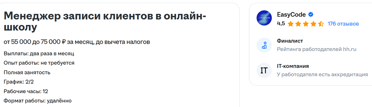 Я в активном поиске работы и планировала найти её за один день, но вакансии попадаются одна хуже другой. Я не то, что не могу найти работу мечты, я не могу даже выбрать меньшее из зол. Всё на уровне "плохо" или "хуже плохого". В этот раз я откликнулась на вакансию "Менеджер записи клиентов в онлайн-школу EasyCode". Школа обучает детей программированию. В вакансии мне понравилось: официальное трудоустройство, обещанная зарплата (от 55 до 75 тысяч) и функционал. Требуется совершать звонки по оставленным заявкам и записывать учеников на пробное занятие. Я подумала: мне нравится, продавать ничего не нужно, а записать на бесплатное занятие, если человек сам заинтересован - звучит несложно. Звонить нужно, конечно, не детям, а их родителям. В самой вакансии ничего отталкивающего нет, но не хватает пунктов, которые мне нужны. Например, оформление с первого дня, оплачиваемое обучение, сумма оклада. А раз их не указали, значит похвастаться тут нечем. Я откликнулась на вакансию, потому что уже о