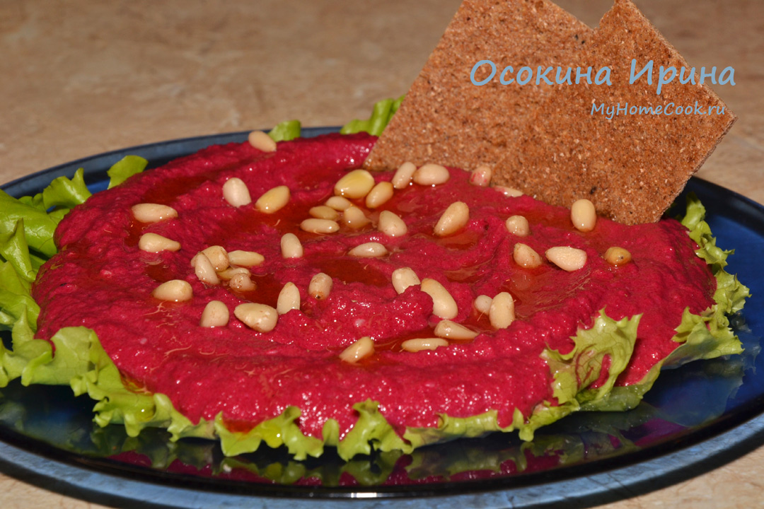 Хумус переводится с арабского как нут, или турецкий горох, который и является базовым ингредиентом блюда. Он весьма универсальный продукт, может употребляться как соус, как закуска, как гарнир или даже как самостоятельное блюдо. Хумус из свеклы - одна из разновидностей традиционного варианта. Итак: 1 отваренную и очищенную свеклу порезала, сложила в чашу блендера и пробила, затем добавила 1 ч.л. с верхом тахини (кунжутной пасты) и 2 ст.л. семян кунжута, 1 резаный зубчик чеснока, 2/3 ч.л. молотого тмина, цедру и сок 1 лимона и 3 ст.л. оливкового масла, посолила, поперчила по вкусу и пробила всё до однородности, разложила по тарелкам, посыпала кедровыми орешками, сбрызнула оливковым маслом и подала с гренками. Волшебно вкусная и даже полезная получилась закусочка) Приятного аппетита