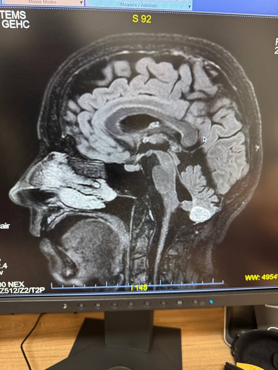 Едем домой. Отснялись. Очень интересно было сегодня. Сделала рентгенолог мне даже какую-то новую программу при которой показываются на снимках четкие картинки области, накапливающей контраст при МРТ. Вон какая красота у меня в голове))) Нейрохирург онколог еще не смотрел, поговорили только с рентгенологом обсудили то, что видим. Ууух! Я довольна тем, что все мои усилия не напрасны и я не фигней страдаю. Расскажу подробнее позже. Может даже после разговора с Доком. В такси миленькая подсветочка и мои блестяшки прям саеркают)))