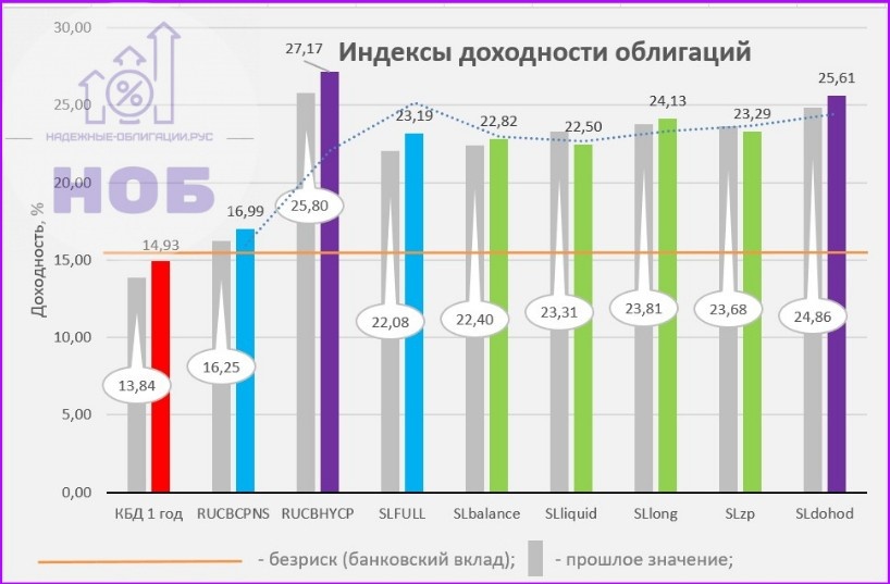Плановый обзор долгового рынка и обновленных портфелей. ✅ Максимальная процентная ставка по вкладам, публикуемая Банком России, 15,55% за третью декаду сентября, практически без изменений; ✅ Индекс ОФЗ (КБД публикуется на сайте Мосбиржи) с дюрацией 1 год (КБД 1 год на графике👆) - плюс процент в течение двух недель, очень мощное движение; ✅ Индекс корпоративных облигаций RUCBCPNS (публикуется на сайте Мосбиржи) - рост меньше процента, но и просел он давеча меньше короткой КБД, так что всё соразмерно; ✅ Индекс высокодоходных облигаций RUCBHYCP (публикуется на сайте Мосбиржи) - а здесь рост доходностей куда серьёзней, почти полтора процента; ✅ Индекс полной доходности Списка Лучших облигаций 2025 SLFULL чуть более процента. В Список вошло 39 облигаций вместо 44 ранее, общий порог входа по YTM не изменялся. ✅ Индекс SLbalance портфеля СБАЛАНСИРОВАННЫЙ - рост меньше чем на полпроцента, стабилен; ✅ Доходность ликвидной части Списка SLliquid - ликвидные бумаги потеряли в доходности, вопреки