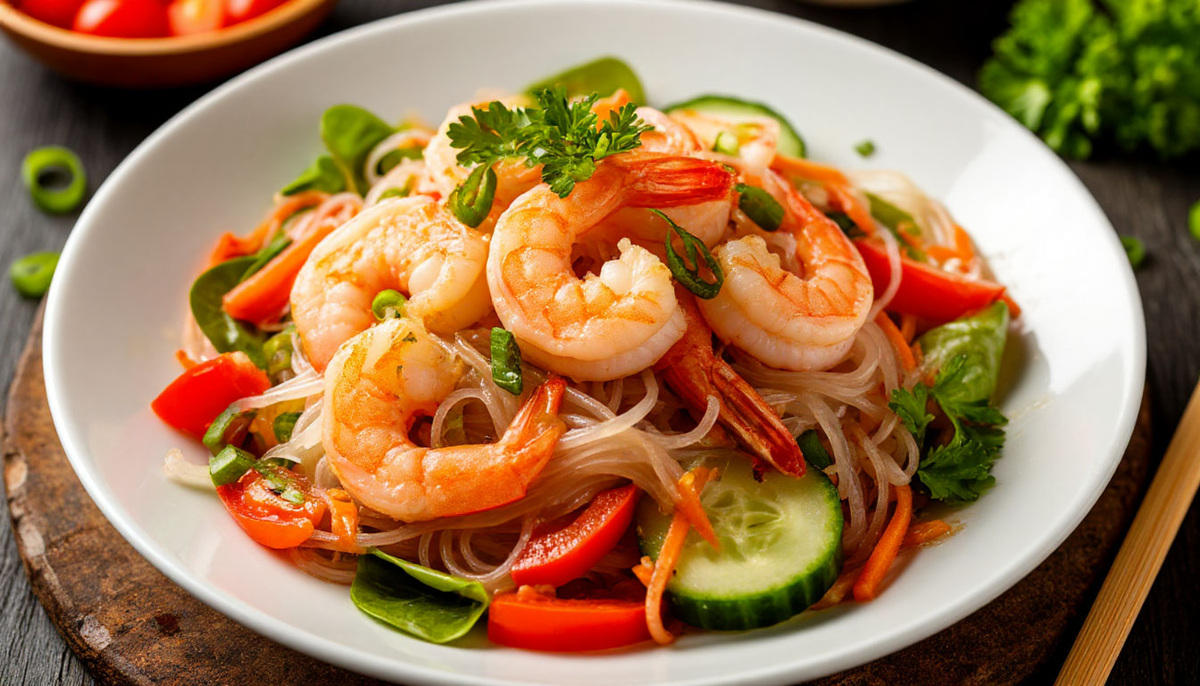 Это салат из свежих овощей, зелени, рисовой лапши и креветок (или курицы/тофу), заправленный ароматным ореховым или лаймовым соусом. Очень свежий, хрустящий и лёгкий. Соус (вариант 1 — ореховый): Альтернатива (вариант 2 — лаймово-соевый соус): 1. Подготовьте лапшу. Залейте рисовую лапшу кипятком на 5–7 минут, затем промойте холодной водой и откиньте на дуршлаг. Можно слегка сбрызнуть кунжутным или растительным маслом, чтобы не слипалась. 2. Подготовьте овощи. Нарежьте морковь, огурец и перец тонкой соломкой (или с помощью овощечистки — длинными ленточками). Авокадо — ломтиками. 3. Креветки. Если креветки сырые — отварите их в подсоленной воде 2–3 минуты, остудите и очистите. Если готовые — просто разморозьте и обсушите. 4. Зелень. Порежьте листья салата, мяту, кинзу или базилик. 5. Соберите салат. В большой миске соедините лапшу, овощи, зелень и креветки. Аккуратно перемешайте. 6. Приготовьте соус. Смешайте все ингредиенты в миске до однородности. При необходимости добавьте немного вод