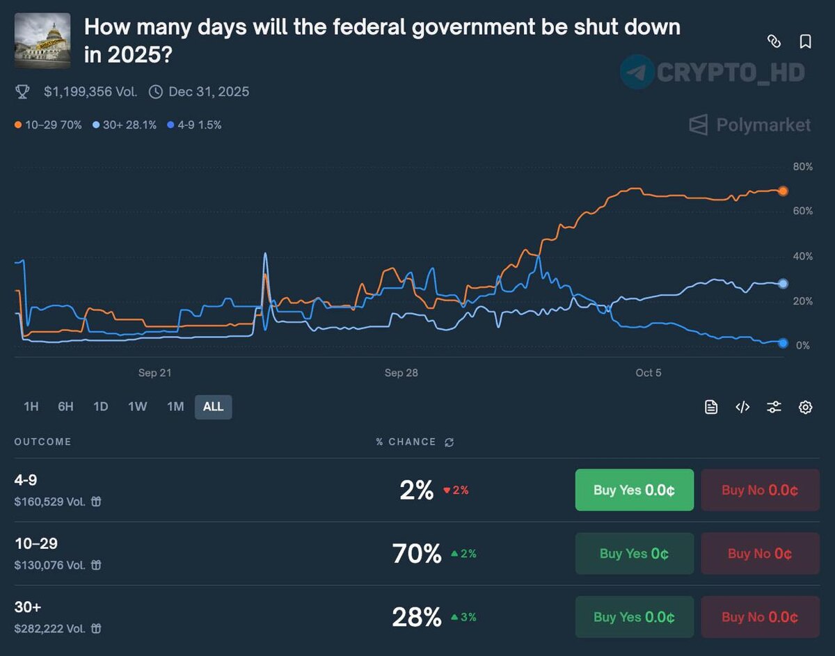 ➥ Приостановка работы правительства США может затянуться почти на месяц с вероятностью 70% (исходя из ставок на Polymarket)