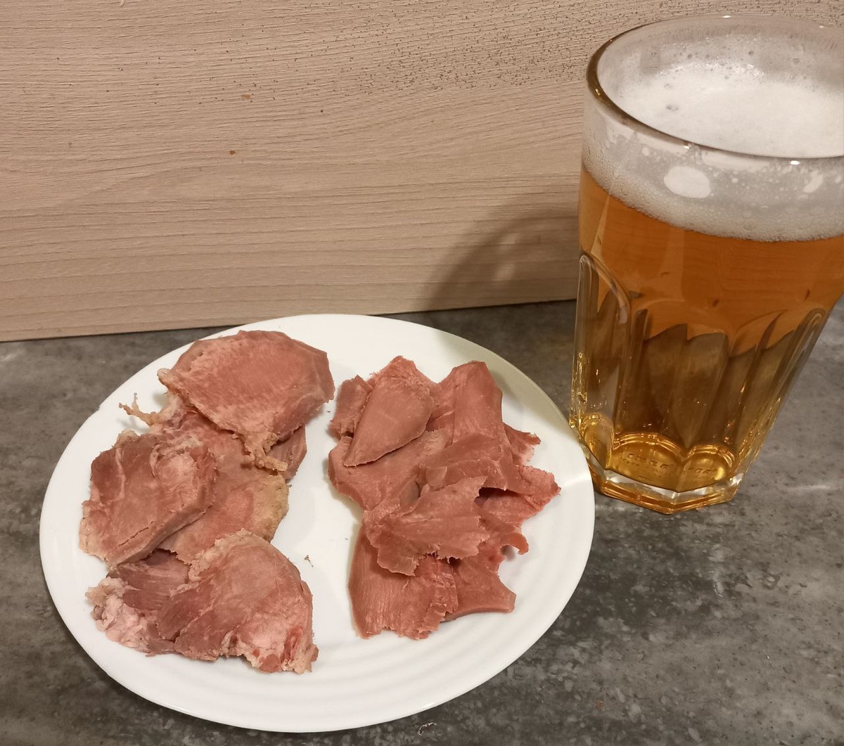 #язык #сувид У меня был очередной эксперимент с приготовлением мясной гастрономии методом су-вид. С одной стороны - он удался, с другой - не очень😏. Если делать по стандартному рецепту для свинины и красного мяса индейки, то есть, 63,5°С и 5,5 часов, то получаем весьма достойный по вкусу продукт, но... есть нюансы. 1. Кожу приходится именно что срезать, счистить или как-то снять её невозможно 2. Самые нежные куски получились из корня языка (слева на блюдце, а вот из кончика - достаточно резиновые (справа). Но... нет худа без добра - резиновые кусочки оказались отличной закуской к пиву😜. Ещё плюс: совершенно не чувствуется, что язык свиной, а не говяжий. Так что теперь ломаю голову какой должен был режим томления и как бы умудриться снять кожу с языка до процесса посола🤔. Скорее всего температура должна быть ~ 55-56°С, а вот сколько времени должен идти процесс, непонятно от слова совсем.