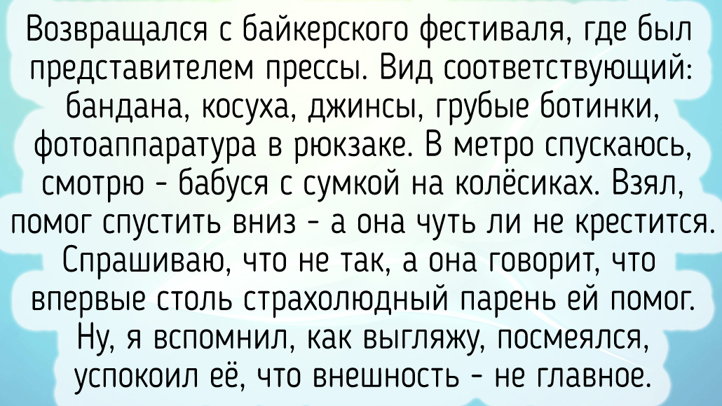 - Возвращался с байкерского фестиваля, где был представителем прессы. Вид соответствующий: бандана, косуха, джинсы, грубые ботинки, фотоаппаратура в рюкзаке. В метро спускаюсь, смотрю - бабуся с сумкой на колёсиках. Взял, помог спустить вниз - а она чуть ли не крестится. Спрашиваю, что не так, а она говорит, что впервые столь страхолюдный парень ей помог. Ну, я вспомнил, как выгляжу, посмеялся, успокоил её, что внешность - не главное. © TheTavrist / ADME