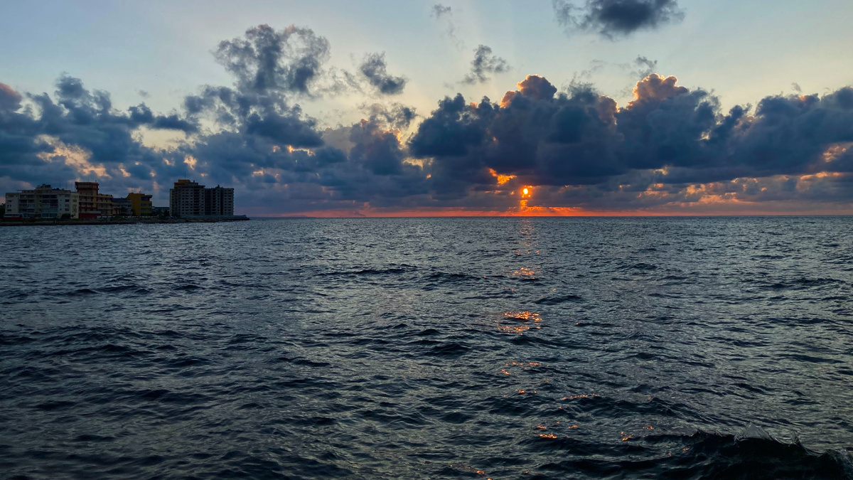 Куба — одна из стран с самыми красивыми закатами в мире, говорится в каком-то рейтинге. Мы у себя из окон дома закатов не видим, окна выходят на восток и север, поэтому нам доступны только восхитительные рассветы. Интересно, они попадают в какой-нибудь рейтинг? Вчера вечером мы с Реем решили прогуляться до Малекона — так называется набережная Гаваны. Да и вообще любая набережная в испанском языке. Так как с 7 до 11 вечера в нашем блоке планировался апагон, решили, что домой торопиться не будем и посмотрим закат на море. Пришли примерно за час, на небе небольшие светлые облака. Ну, думаем, закат будет видно хорошо. Не тут-то было. Чем ниже опускалось солнце, тем сильнее вокруг него сгущались тучи. В итоге мы подсмотрели закат в маленькую щёлочку между тучами и морем. Никакого буйства красок, огненно-оранжевого или нежно-розового неба, на которое мы рассчитывали. Потеряли надежду и побежали домой, ведь в тёмное время суток на улице небезопасно. Домой шли по одному из центральных проспект