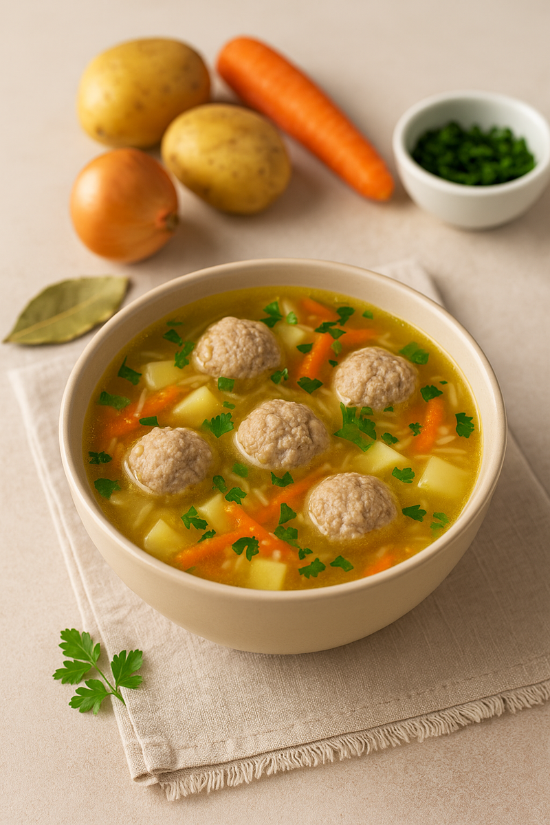 Сегодня я расскажу, как приготовить классический суп с фрикадельками дома — без кулинарных премудростей, но с секретами, которые делают вкус по-настоящему насыщенным. Для 4 порций (кастрюля 2,5–3 литра): Для фрикаделек: Для супа: Когда суп готов, выключите плиту и дайте ему настояться под крышкой 10 минут. Подавайте с нарезанной зеленью — она придаёт свежесть и лёгкий аромат. Домашний суп с фрикадельками — это тот случай, когда минимум усилий даёт максимум удовольствия. Он подойдёт и для повседневного обеда, и для уютного ужина в выходной. Главное — не бояться экспериментировать и добавлять что-то своё: любимые специи, зелень или овощи. А какой суп с фрикадельками вы любите готовить? Пробовали ли делать его с необычными ингредиентами? Делитесь своими вариантами в комментариях — вместе соберём коллекцию лучших домашних рецептов!