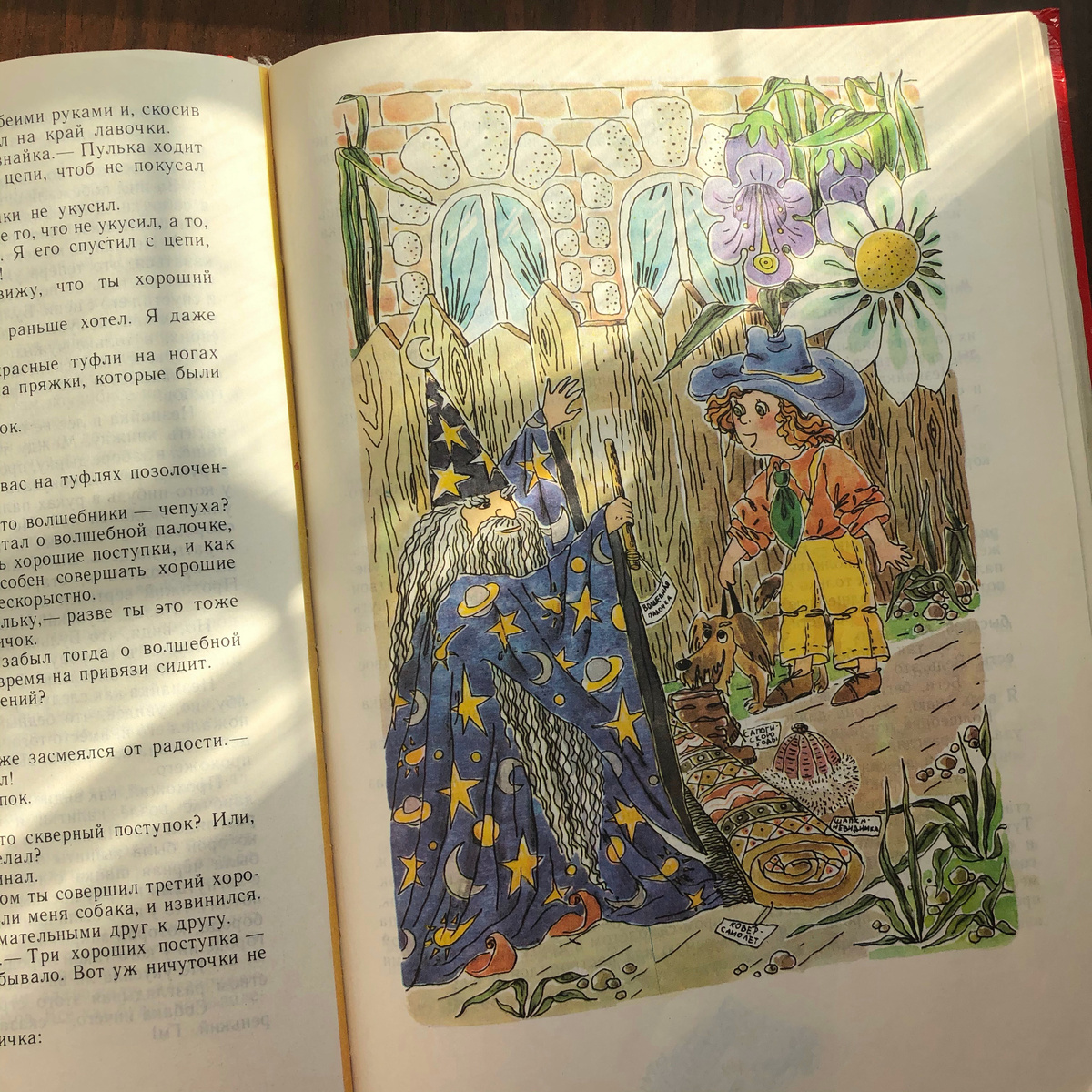 Еще одна любимая книга детства. Откуда взялись эти малыши и малышки? Где их родители? Вырастут ли они и станут ли взрослыми? Волшебник, который дал Незнайке волшебную палочку, старый и с бородой — значит, такое возможно… Вопросы проносились в голове, но не мешали получать от книжки удовольствие. В детстве у меня был зеленый трехтомник Носова 1969 года, зачитанный, обтрепанный. Обложки в конце концов оторвались, «Незнайку на Луне» стащили. А два первых тома отдали в переплет, и они выдержали еще одно читательское поколение, их и на моих детей хватило. Еще в 90-х было куплено перестроечное издание большого формата, с цветными иллюстрациями. Самое любимое в «Незнайке» — путешествия! На воздушном шаре в Зеленый город и на автомобиле — в Солнечный. Путешествие в Солнечный город — прекрасный пример того, что утопия может быть интереснее антиутопии. Мне до сих пор жаль, что Незнайка, Кнопочка и Пестренький так и не посмотрели дома архитектора Арбузика. Это точно было бы интереснее, чем ослы
