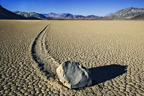 Представьте себе огромную, плоскую как стол глиняную равнину под названием Рейстрэк-Плайя (Racetrack Playa). Название говорящее — она действительно похожа на гигантский ипподром. Это дно древнего озера, которое давным-давно высохло. Поверхность его настолько ровная, что кажется, будто её выровняли гигантским шпателем. В сухом состоянии глина трескается на причудливые шестиугольники, а после дождя превращается в непролазную, липкую грязь.