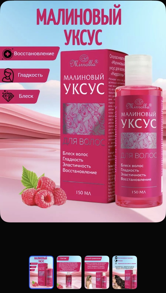 МАЛИНОВЫЙ УКСУС применяют как финальный этап ухода за волосами — наносят на чистые влажные волосы по всей длине (кроме корней), выдерживают 2-3 минуты и тщательно смывают. Средство закрывает кутикулу волоса, придавая гладкость, блеск и облегчая расчесывание, а также помогает сохранить цвет окрашенных волос и очищает волос от лишнего перегруза стайлинга (который не смогли тщательно промыть). Преимущества использования: Блеск и гладкость: Уксус "запечатывает" чешуйки кутикулы, делая волосы более гладкими и блестящими. Укрепление и уплотнение: Восстанавливает структуру поврежденных волос, предотвращая ломкость и сечение. Сохранение цвета: Закрывает кутикулу, удерживая пигмент внутри волоса и продлевая стойкость окрашивания. Очищение и объем: Очищает структуру волос от омертвевших клеток и излишков жира, что придает тонким волосам объем. Легкое расчесывание: Волосы становятся более послушными и рассыпчатыми, легче поддаются расчесыванию и укладке. Убирает статическое электричес