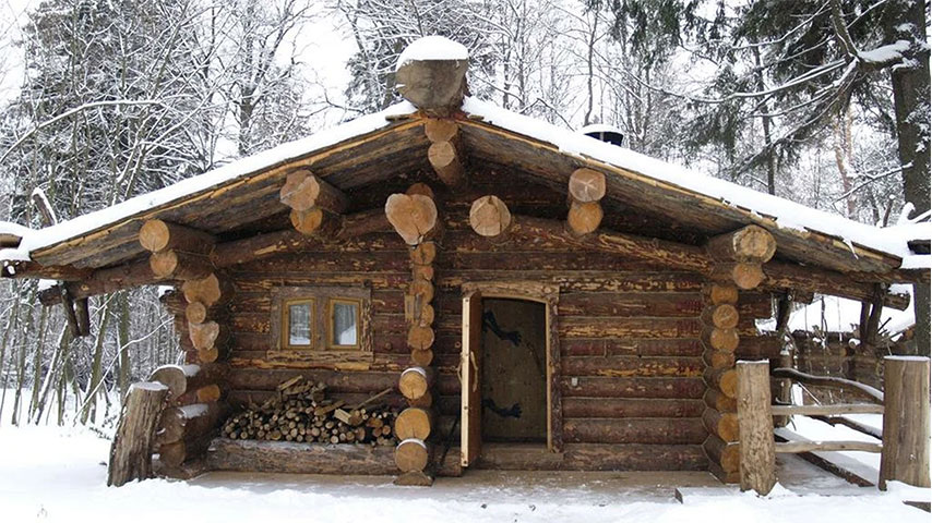 Лес подбирается от 25 сантиметров в диаметре, это минимальный размер, при котором будет достаточно долго удерживаться тепло от печи в зимний период. Если планируется одновременное проживание нескольких человек, то сруб потребуется рубить не менее 5х3,5 метра, для одного или двух охотников подойдет изба размером 3х3,5 метра. Число венцов сруба подгоняют под свой рост или чуть больше, для слишком высокой избы потребуется большее количества дров для отопления. Углы сруба чаще рубят в чашу, а паз по бревну не выбирают, лишь стесывают для более плотного прилегания бревен. Нижний ряд всегда из самых крепких и крупных бревен укладывают прямо на землю.