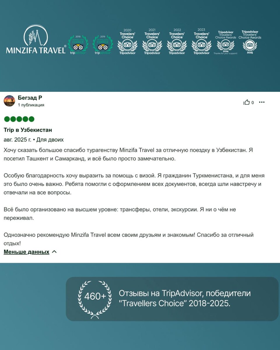 🌍 Отзывы наших туристов на TripAdvisor! 🌟 Дорогие путешественники! Мы очень гордимся тем, что наши гости делятся своими впечатлениями о путешествиях с нашей турфирмой на платформе TripAdvisor. Их честные отзывы помогают нам становиться лучше и вдохновляют новых туристов открыть для себя удивительные маршруты и незабываемые эмоции. Спасибо всем, кто уже побывал с нами в пути и оставил свои слова благодарности! Если вы еще не знакомы с нашими путешествиями — заходите на TripAdvisor, читайте отзывы и планируйте своё следующее приключение вместе с нами! Пусть ваши путешествия будут яркими и наполнены только позитивными эмоциями! ✈️🌟