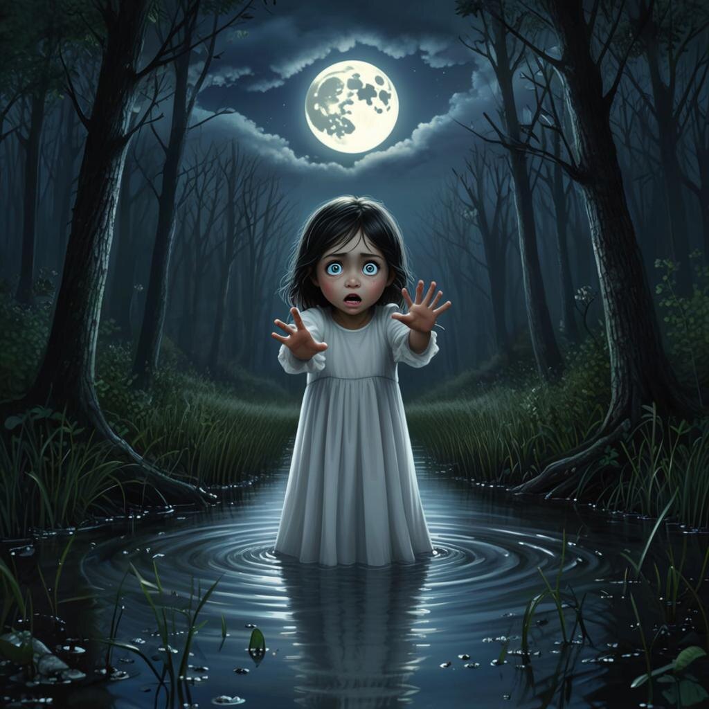 Вдруг камыши расступились, и я увидел ее. Маленькая девочка, лет пяти, в белом платьице, стояла по колено в воде и плакала, закрыв лицо руками. Ее светлые волосы растрепались, а плечи вздрагивали от рыданий. -Ты кто? И как здесь оказалась? - прошептал я, боясь нарушить звенящую тишину болотной ночи.