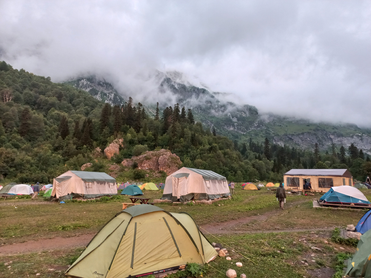 На сегодня был запланирован радиальный выход через Фишт-Оштенский перевал к озеру Псенодах. Хотя где-то в глубине души мы надеялись, что пока завтракаем, погода разгуляется, но уже понимали, что прогулка до озера отменяется. И действительно, не успели мы еще приготовить чай, как пошёл дождь, и он продолжался до самого обеда, то немного стихая, то припуская так, что в какой-то момент наша палатка дала небольшую «течь».