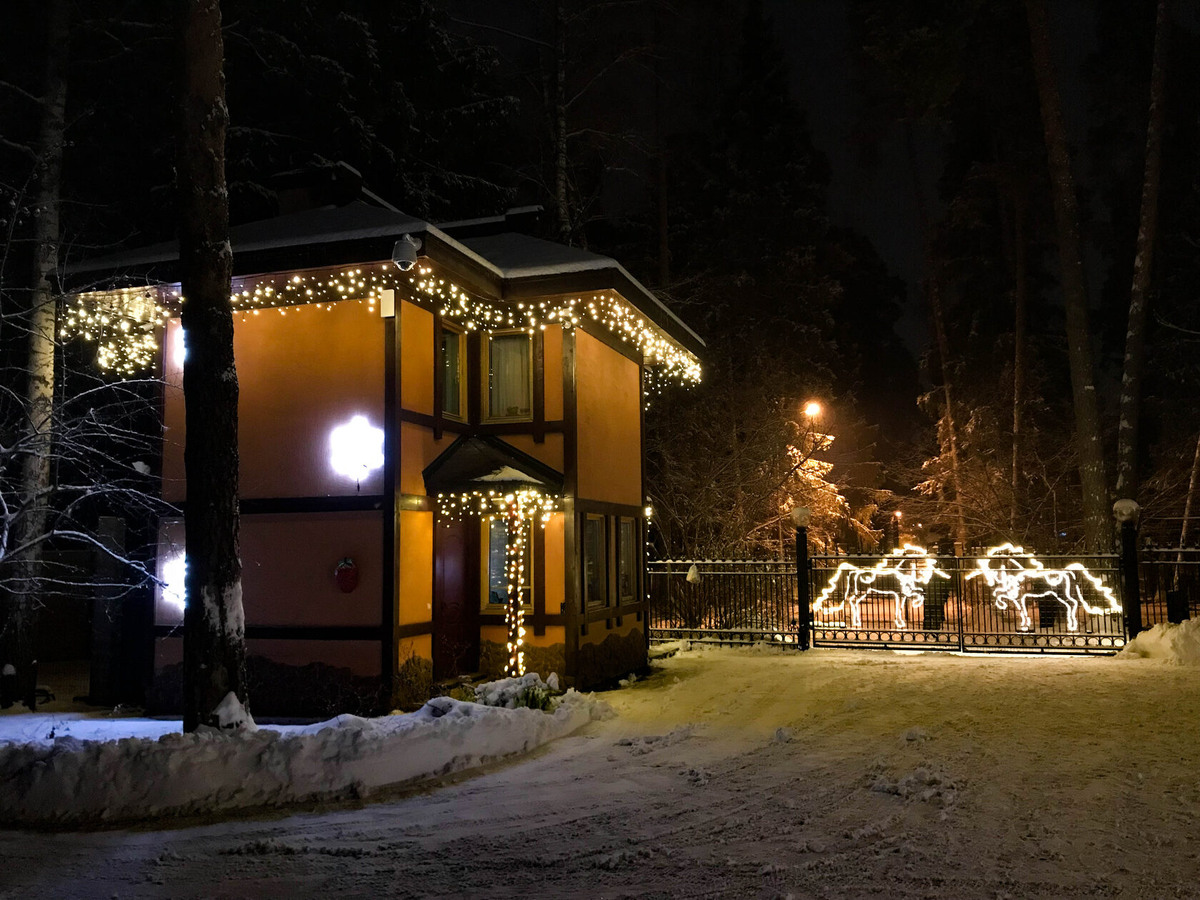 Гирлянды и светодиодные ленты. Используйте их для подсветки окон, карнизов и контура крыши. Теплый белый свет создаст уют, а разноцветные огни добавят веселья.
