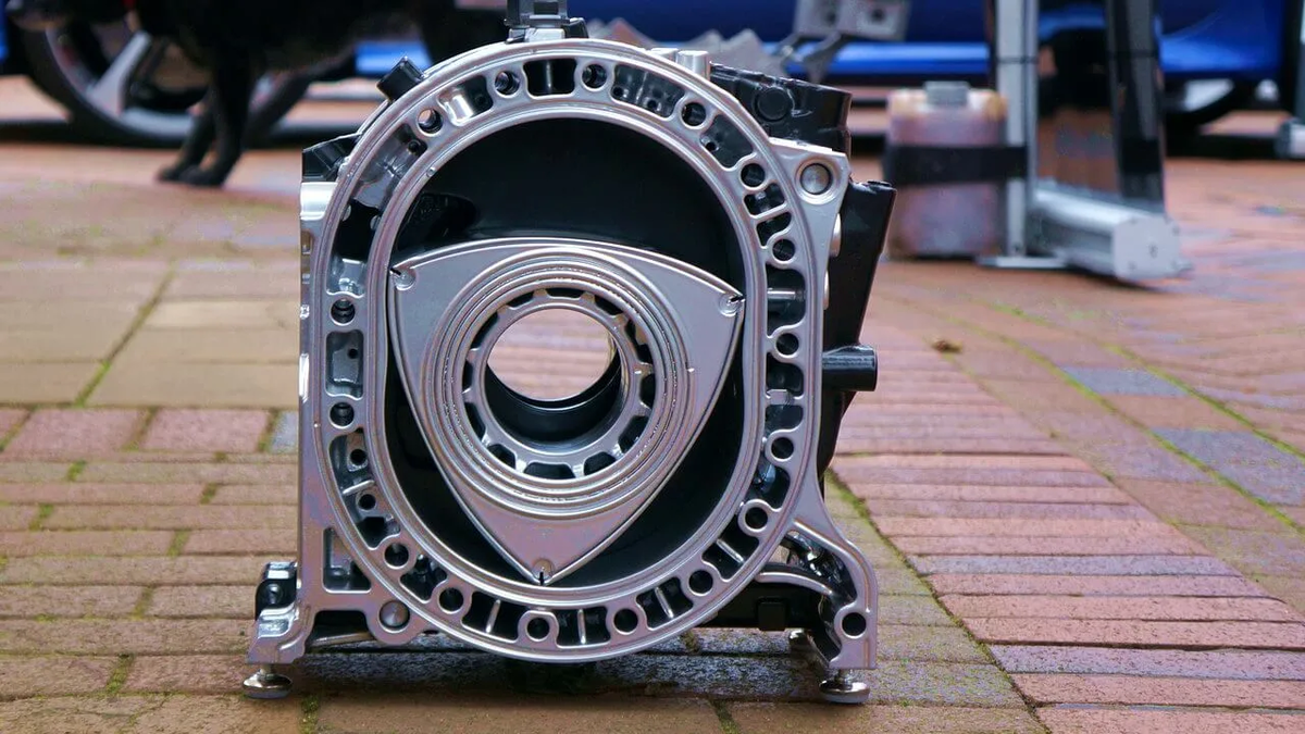 Вместо них — треугольный ротор, вращающийся в овальной камере. Он сам выполняет роль поршней, шатунов и клапанов одновременно. Благодаря этому мотор получается в разы компактнее и легче. Но при этом способен выдавать мощность, как у гораздо большего по объёму двигателя. Представь треугольник, который крутится внутри овала.