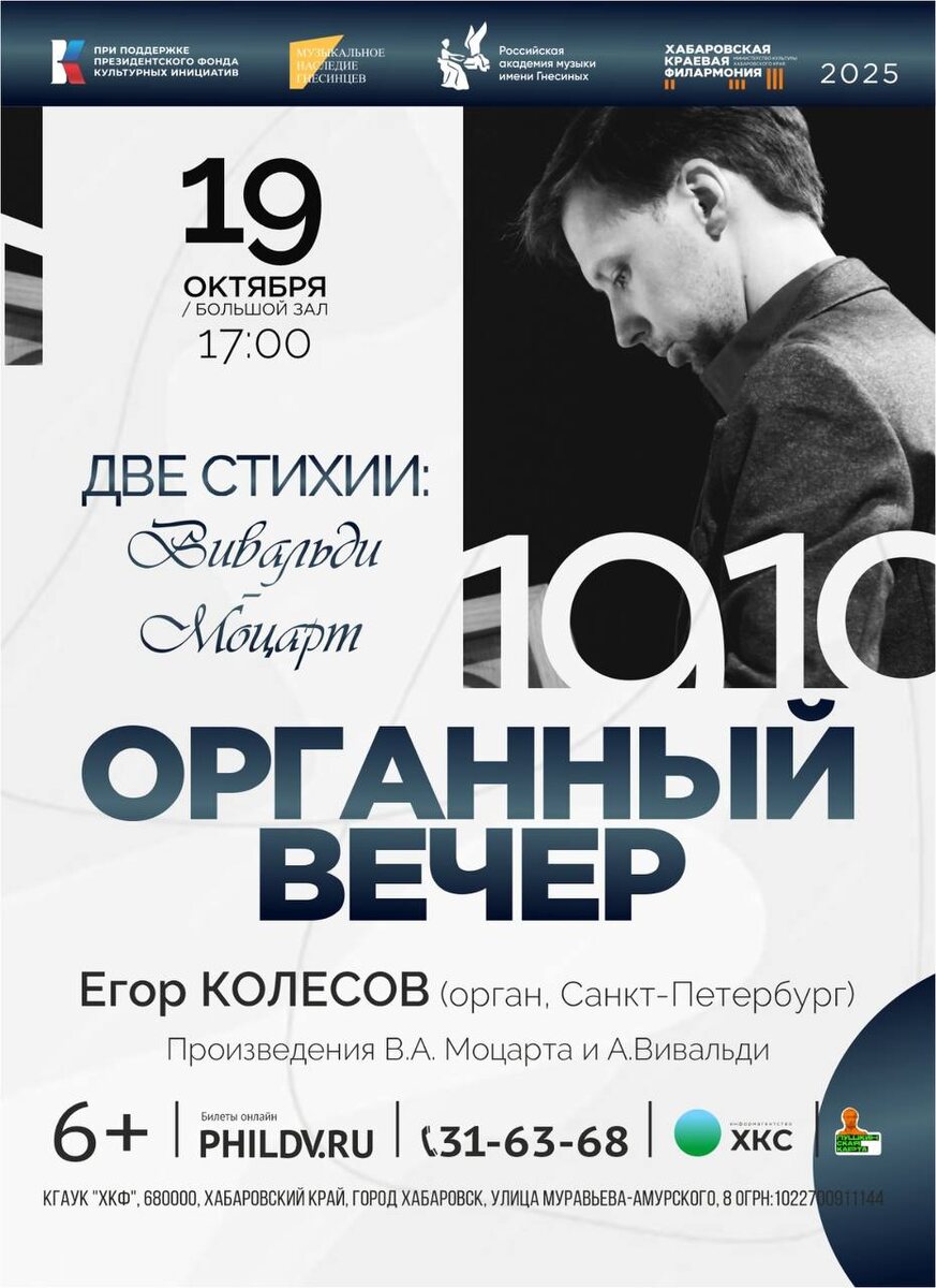 Концерт органной музыки «Вивальди – Моцарт: две стихии» ✔ Диалог двух музыкальных вселенных: страстное барокко и изящный классицизм ✔ Произведения Вивальди и Моцарта в звучании органа ✔ Исполнитель — петербургский органист Егор Колесов ✔ Виртуозное мастерство и глубокая интерпретация ✔ Погружение в атмосферу двух великих эпох 📅 Когда: 19 октября 2025 ⛳ Где: Большой зал Хабаровской краевой филармонии, ул. Муравьева-амурского, 8 💳 Стоимость: 500-1200 ₽ Билеты 👉 Афиша Хабаровска. Куда сходить, экскурсии