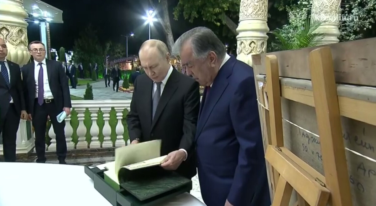 Во время визита в Душанбе Владимир Путин подарил Эмомали Рахмону книгу «Таджики», посвящённую истории таджикского народа, и картину советского художника Макса Бирштейна «Таджикские друзья». Подарки президент России вручил на неформальном обеде в ботаническом саду «Ирам», который предшествовал официальным переговорам, сообщается на сайте Кремля. Глава российского государства прилетел в Таджикистан вечером 8 октября. У трапа самолёта его встретил президент Эмомали Рахмон. В тот же день Путин посетил мемориальный комплекс «Национальное единство и возрождение Таджикистана» и возложил венок к памятнику Исмоилу Сомони. Во время государственного визита состоятся переговоры о развитии стратегического партнёрства между Москвой и Душанбе. Кроме того, 9 октября Путин подключится ко второму саммиту «Центральная Азия – Россия», а 10 октября – к заседанию Совета глав государств СНГ, где обсудят совместные экономические и региональные инициативы.