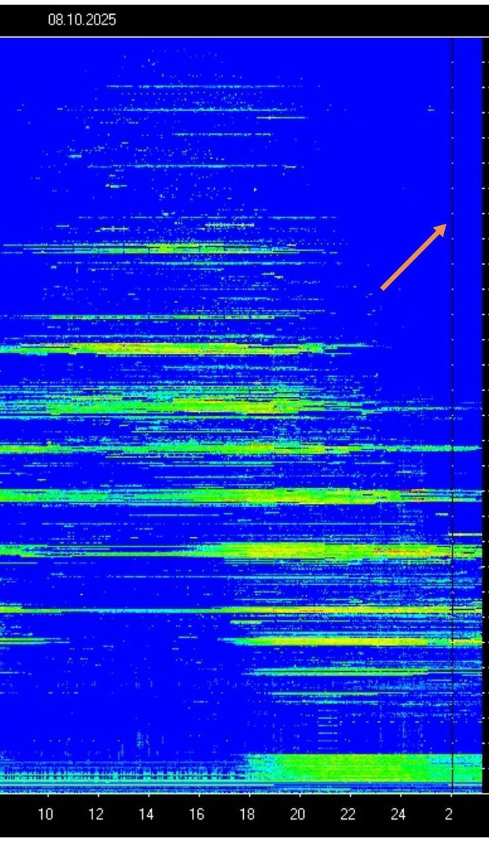 В ответ на пост За 14 часов сильной сейсмики пока не последовало, да и умеренной уровня М5.5+ тоже не было. Только что прошли дополнительные электромагнитные сигналы по ЭМФ (зашкал на фото 1) и сонограмме ШР в Томске (фото 2). Так что интрига может раскрыться уже завтра 09.10.25
