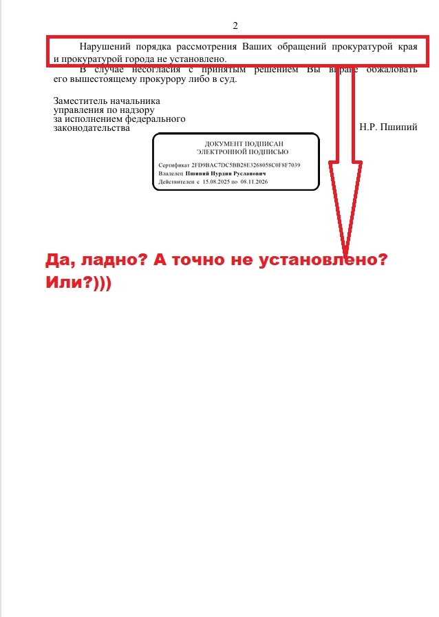 Мною получен ответ от заместителя начальника управления по надзору за исполнением федерального законодательства прокуратуры Краснодарского края Пшипий Н.Р. от 07.10.2025 № Отв-07/2-2123-25/479340, который является образцом циничной формальной отписки и грубейшим образом игнорирует суть моих доводов, а также факт предшествующего обжалования аналогичных нарушений.