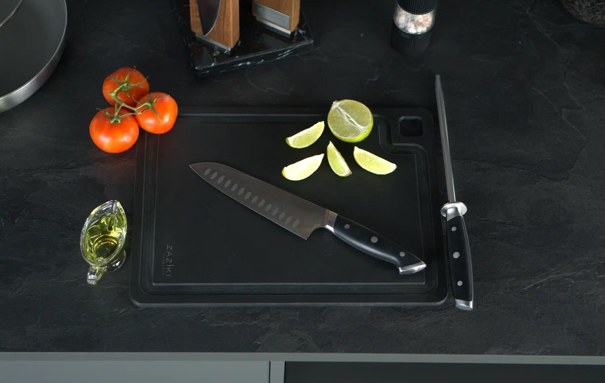 Готовить легко, когда в руках инструмент, созданный не для галочки, а для настоящей работы. Японский нож Сантоку – это не экзотика, а практичный ответ на повседневные кухонные задачи: от утренней нарезки овощей до вечернего филе из лосося. Слово «сантоку» отражает три основные функции ножа: нарезка, шинковка и измельчение. Это не универсальный нож из разряда «для всего», а продуманный инструмент, созданный для максимальной эффективности, и подходит для 90 % задач на кухне. Конструктивные особенности Сантоку: В ножах Сантоку от ZAZIKI мы объединили японскую философию (минимализм, уважение к ингредиентам, внимание к деталям) и европейский подход (эргономичная ручка, идеальный баланс, безопасность в использовании). 👉 Перейти в каталог ZAZIKI Дамасская сталь – это технология, проверенная веками и адаптированная под современные требования. В ножах ZAZIKI – 67 слоев стали, сплавленных в единое целое. Такая структура обеспечивает уникальное сочетание прочности и гибкости. Преимущества дамас